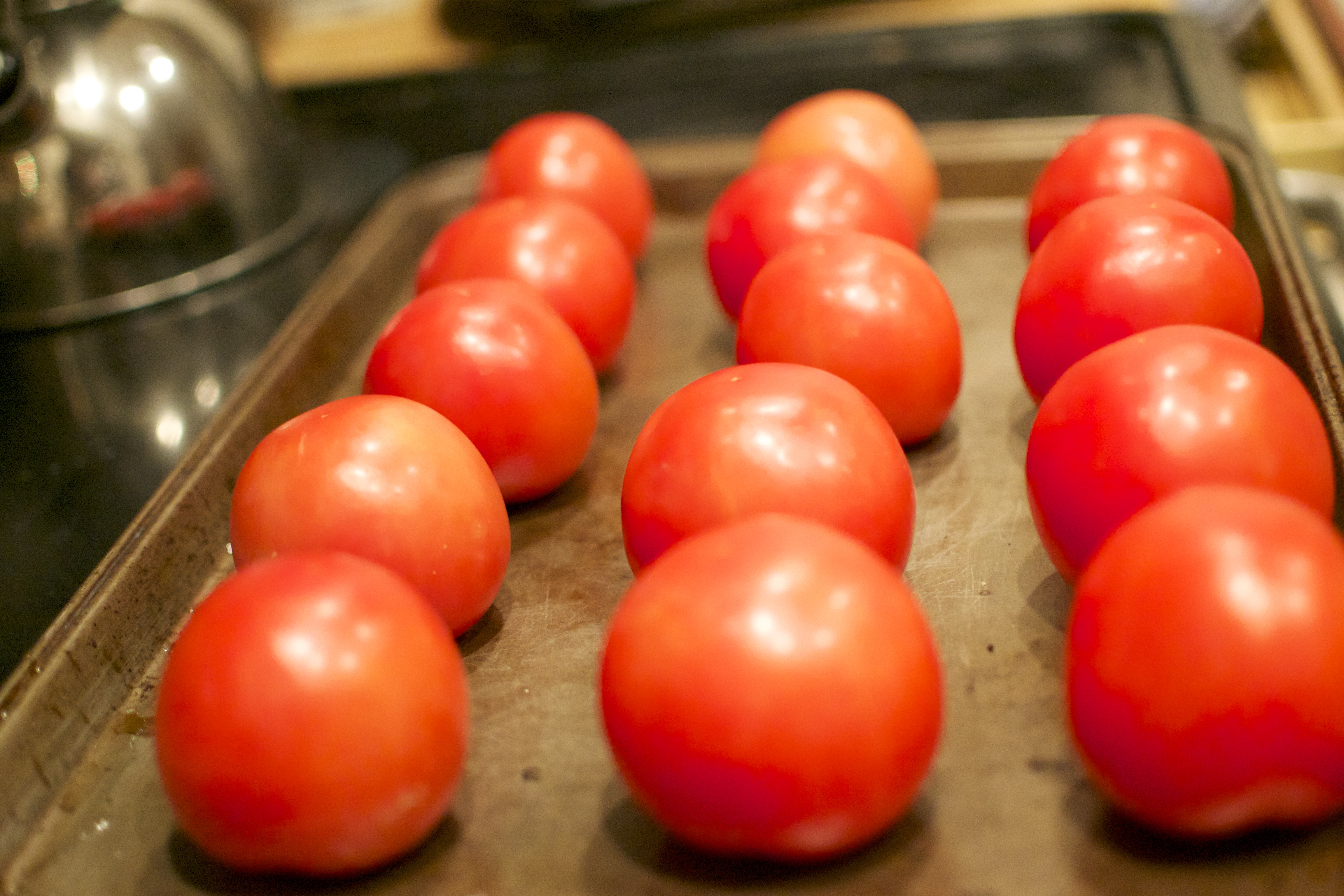 I placed 14 small/medium”ish” tomatoes (on the vine) onto a baking sheet.
