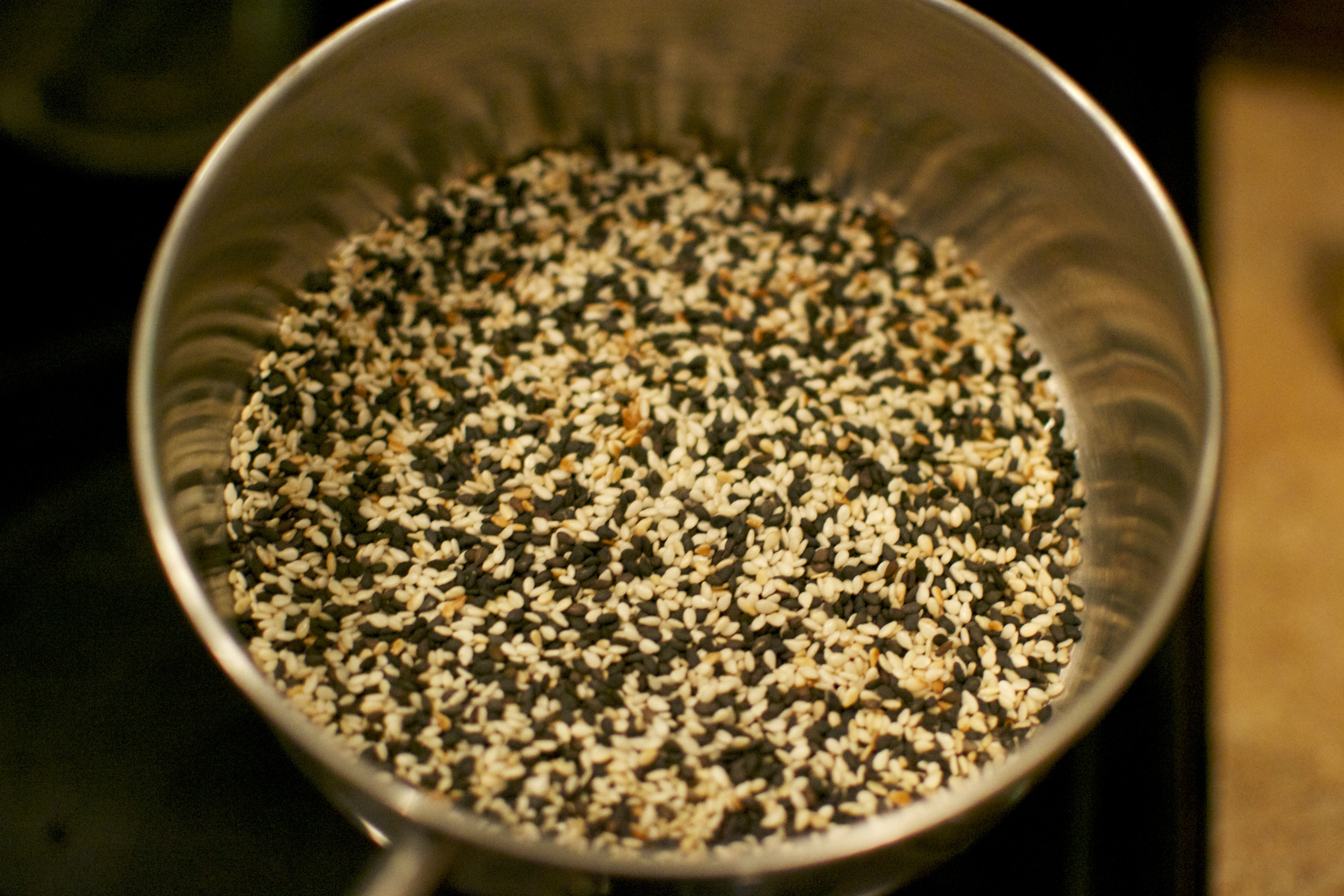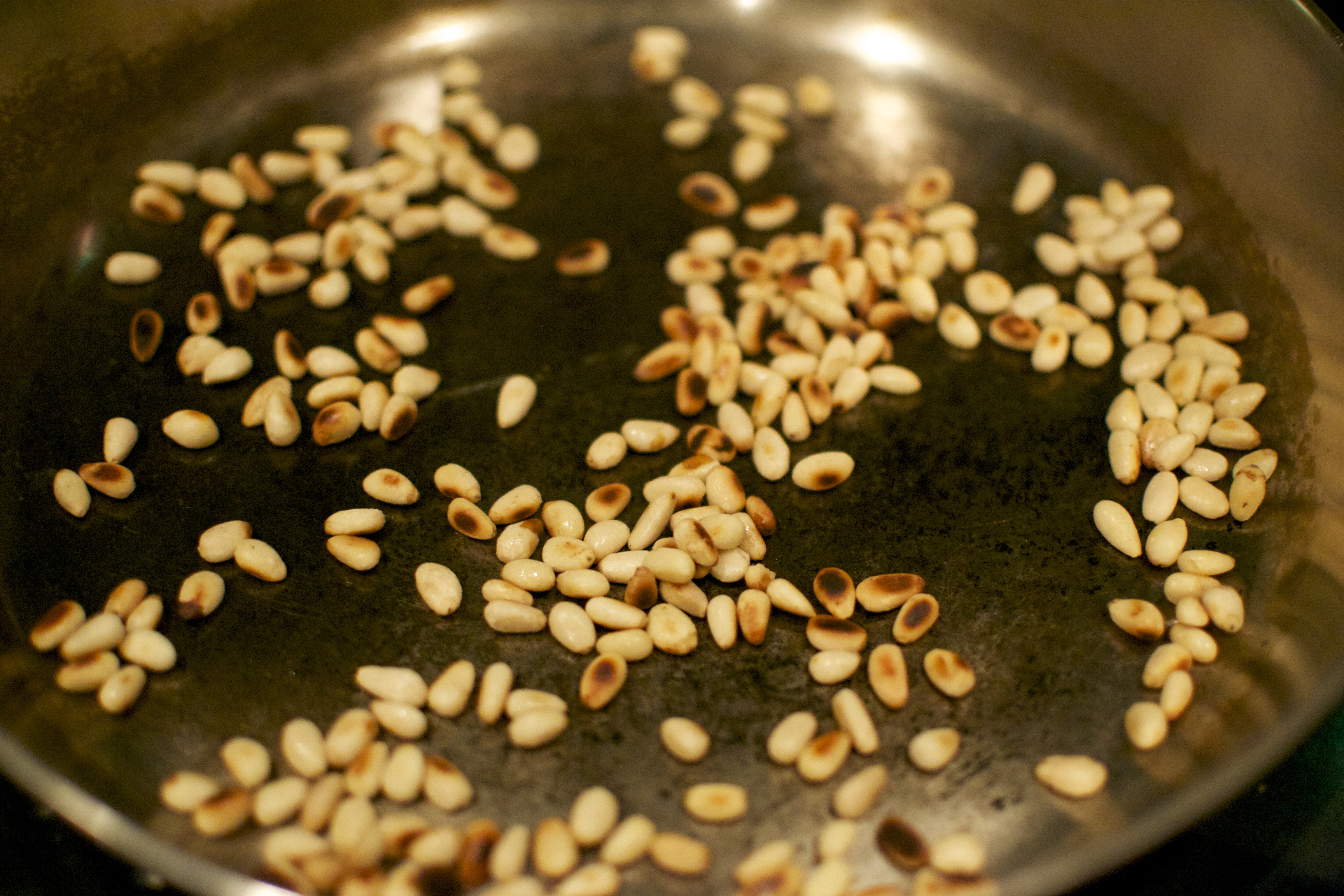 I grabbed a handful and a half of pine nuts and placed them and dry roasted them in a frying pan.
