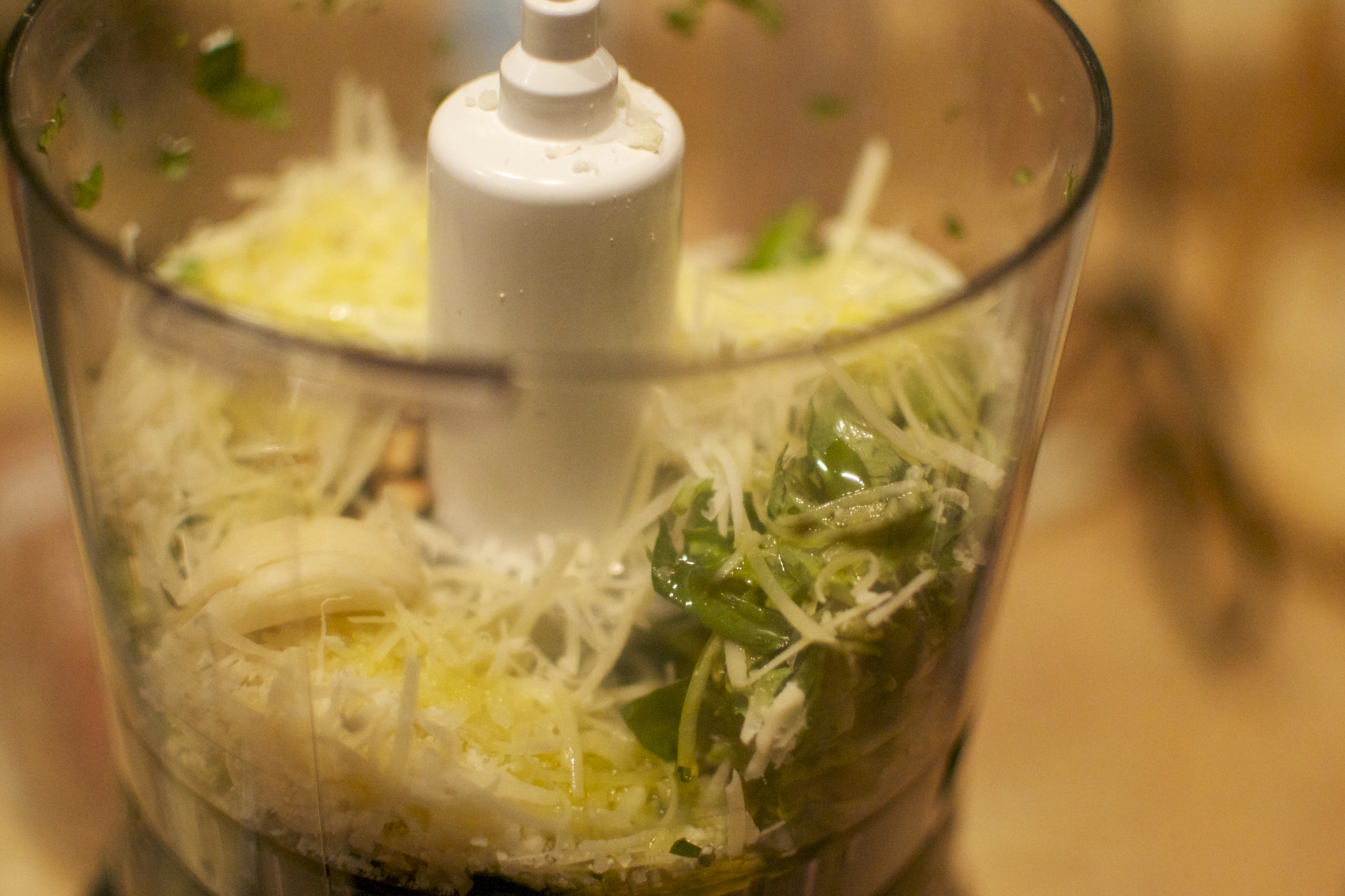 In the food processor, I put a batch of fresh basil, four garlic cloves, a handful of fresh grated Parmesan cheese and poured some olive oil. Sorry, I did not take any measurements, I just used my eyes as a judge….and then ma mouth 😉