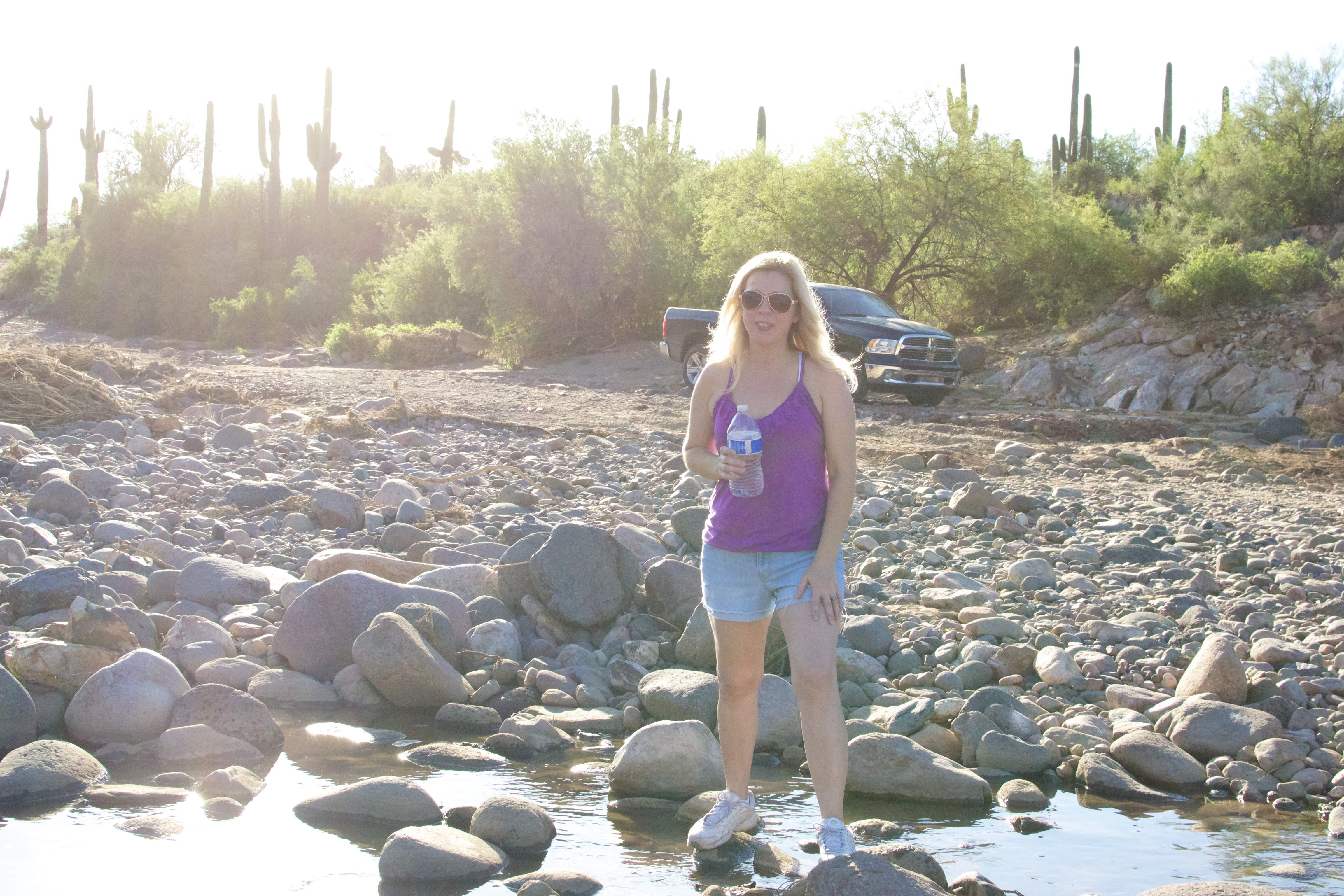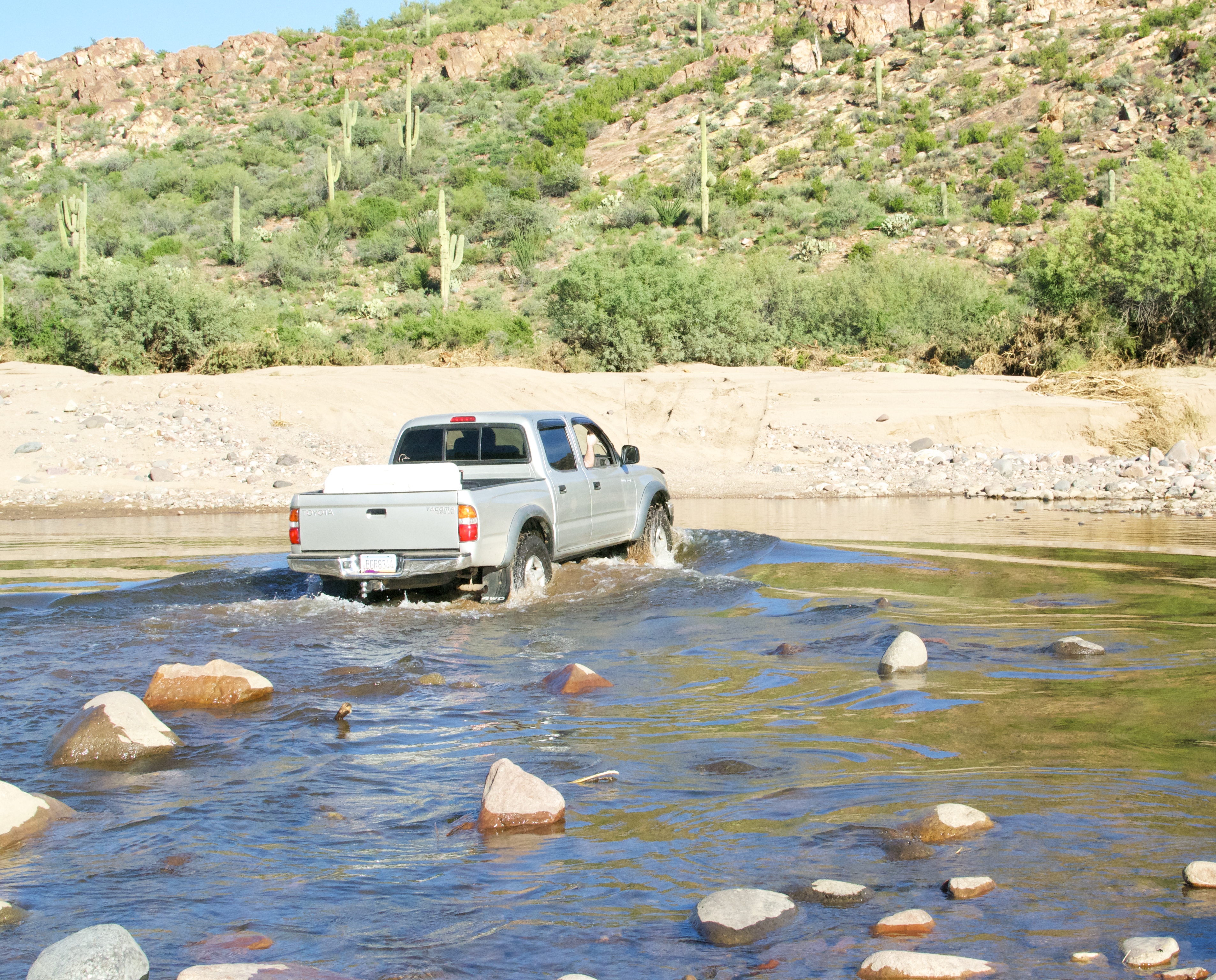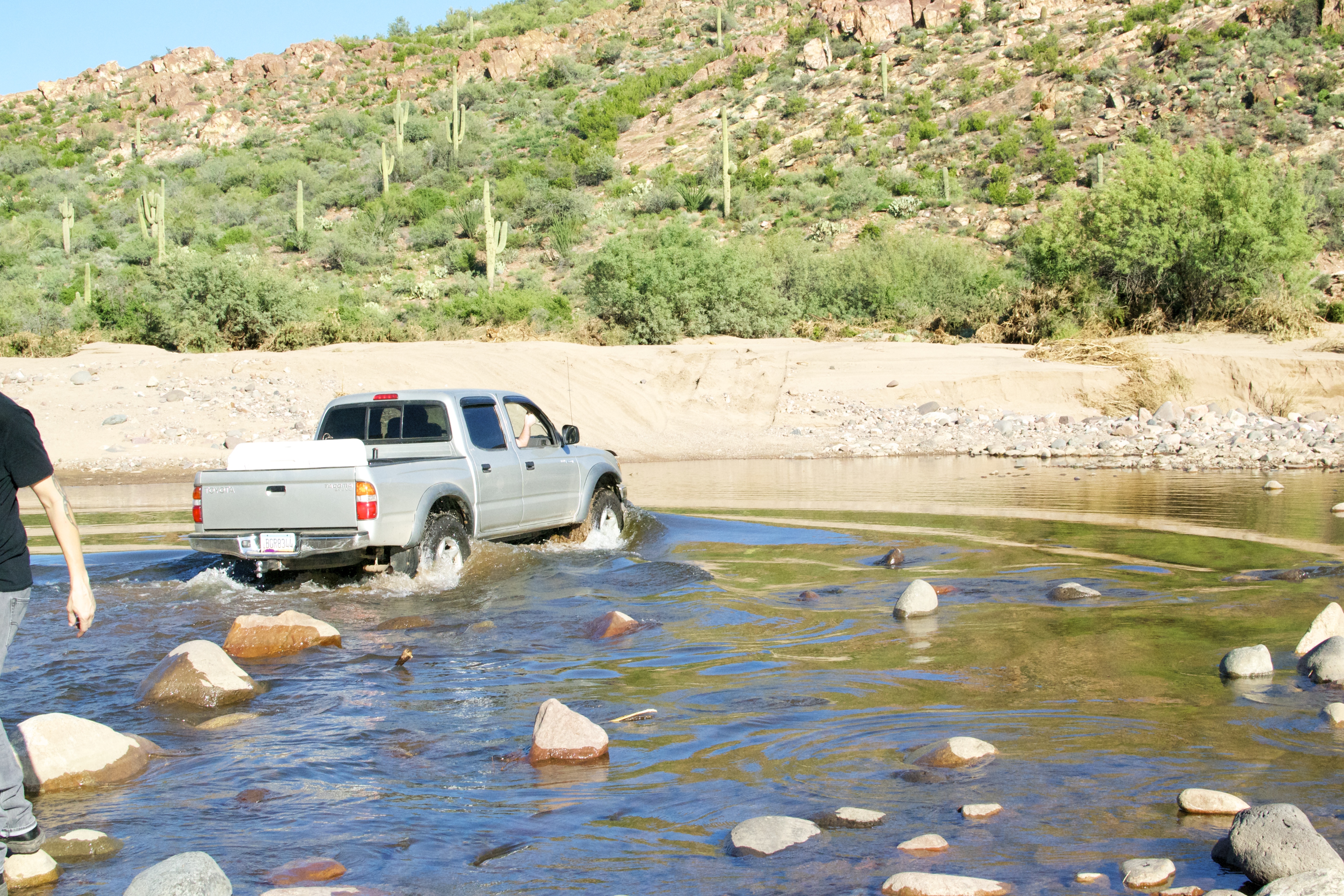 Odd enough, I was wearing my vans instead of flip flops so I decided to walk across to test the waters. You know..check out how deep the water was and point out big ole boulders in the wash. The water came up to the middle of my thigh (which if you know me…really is not that tall) and there were a few boulders the guys needed to avoid. Of course I was not done with my assessment before my mister jumped in the Tacoma and cruised across!!