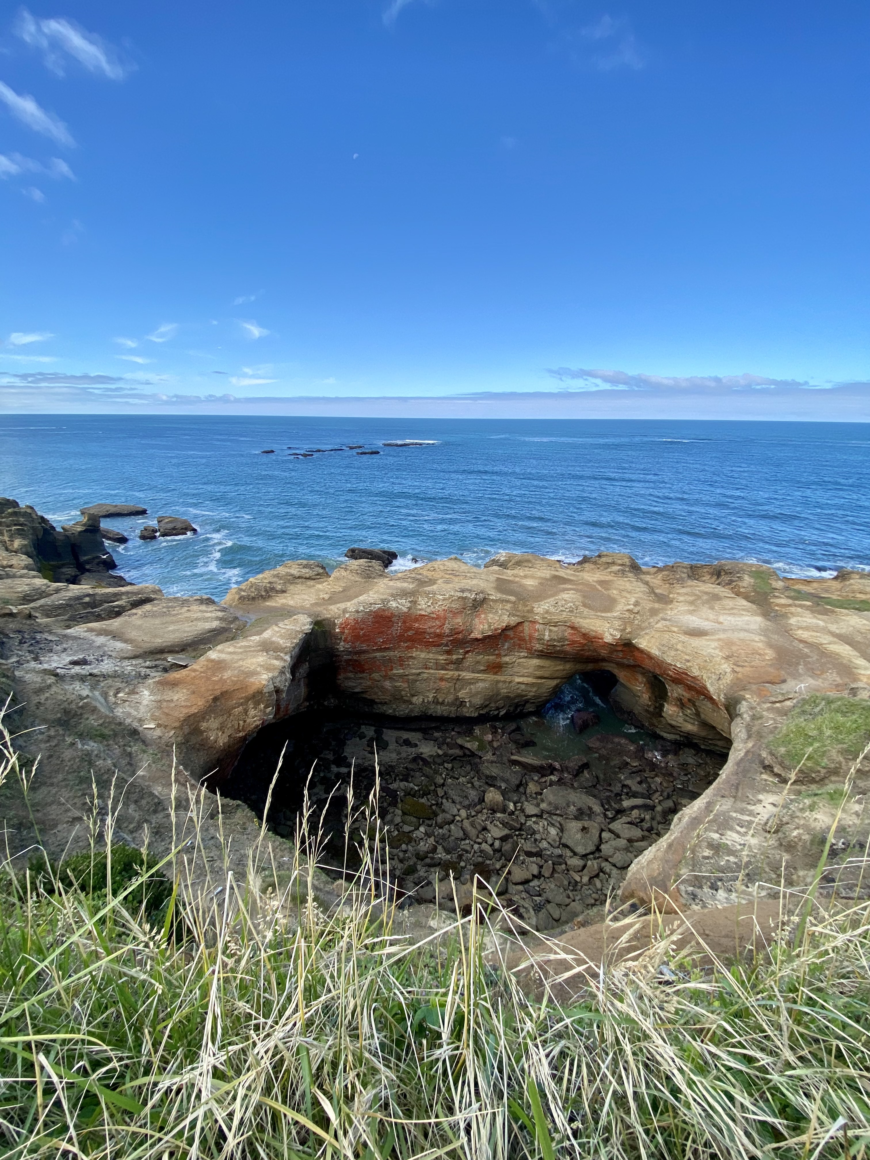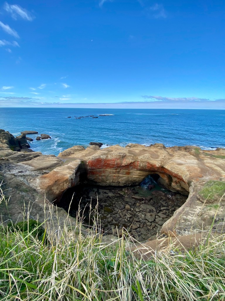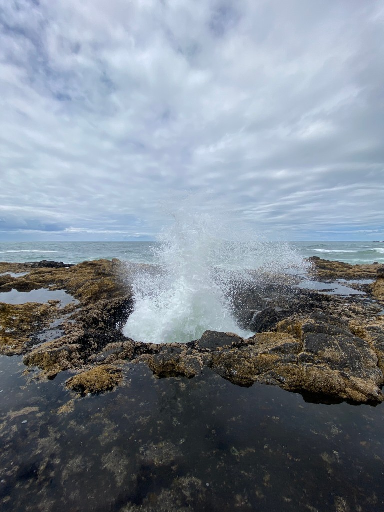 Thors Well just outside of Yachats is a hole in the rocks in along the shoreline. It used to be a sea cave but it collapsed and now, during high tide, the water drifts in spouts with awesome splashes and then pulls back out to sea. The walk from the parking lot along the 101 was easy until I got to the slippery volcanic rock where I had to be careful not to slip and crack my skull. Also there are tide pool creatures laying about so I had also pay mind not to squash them. Its pretty epic and I could have sat there for hours watching, it never got old and the funny thing is that every time..I mean, every time the splash came we (there was quite a crowd) all ooooooo’d and awwwwww’d like we had never seen it before.
